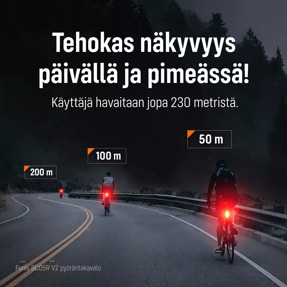Fenix BC05R V2.0 pyörän takavalo on erinomaisesti näkyvä ja monipuolinen takavalo. Jopa 200 metriin näkyvä punainen valo takaa sen, että pyöräilet tai liikut esim. juosten tai kävellen näkyvästi. Huippunopea ja kestävä USB-C latausportti lataa takavalosi tyhjästä täyteen vain 1,5 tunnissa! Yhdellä latauksella BC05R toimii peräti 120 tuntia yhtämittaisesti! Ajat siis joka päivä kaksi tuntia yhden kuukauden ajan ja tämä vain yhdellä lataus kerralla!