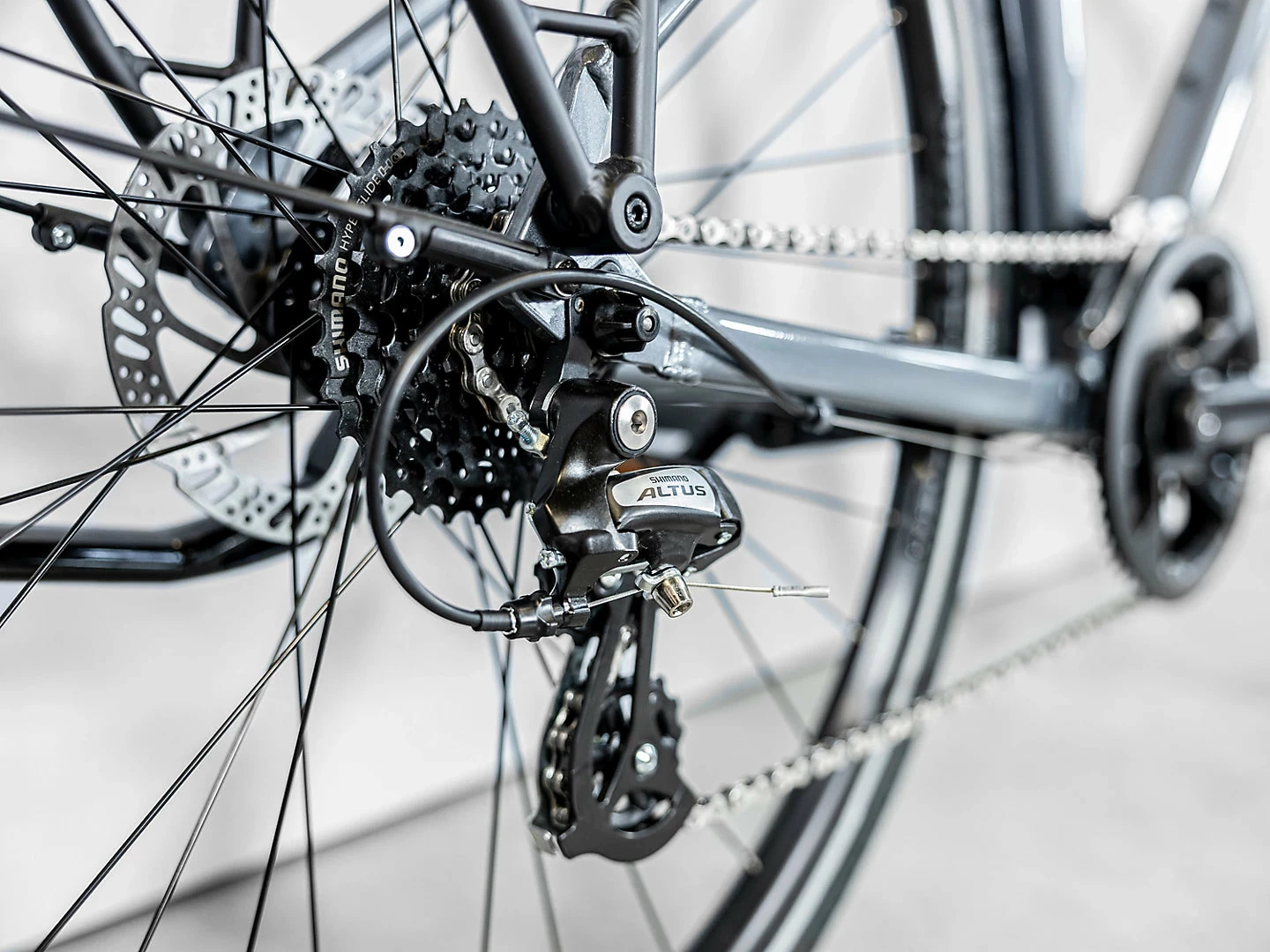 Etu- ja takavaihtaja: Shimano Tourney TY710, Shimano Altus M310 - Jarrut: Tektro MD-M280, mekaaninen levyjarru, 160 mm:n jarrulevy